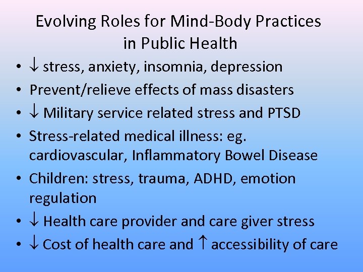 Evolving Roles for Mind-Body Practices in Public Health stress, anxiety, insomnia, depression Prevent/relieve effects of mass disasters Military service related stress and PTSD Stress-related medical illness: eg. cardiovascular, Inflammatory Bowel Disease • Children: stress, trauma, ADHD, emotion regulation • Health care provider and care giver stress • Cost of health care and accessibility of care • •