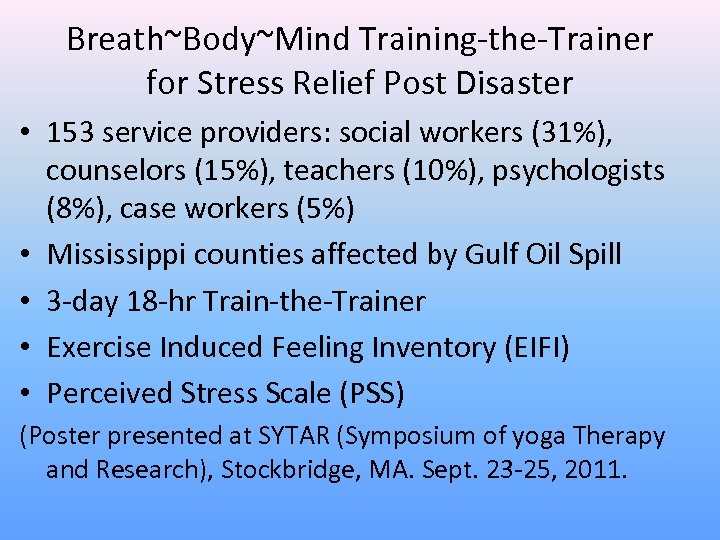 Breath~Body~Mind Training-the-Trainer for Stress Relief Post Disaster • 153 service providers: social workers (31%), counselors (15%), teachers (10%), psychologists (8%), case workers (5%) • Mississippi counties affected by Gulf Oil Spill • 3 -day 18 -hr Train-the-Trainer • Exercise Induced Feeling Inventory (EIFI) • Perceived Stress Scale (PSS) (Poster presented at SYTAR (Symposium of yoga Therapy and Research), Stockbridge, MA. Sept. 23 -25, 2011.