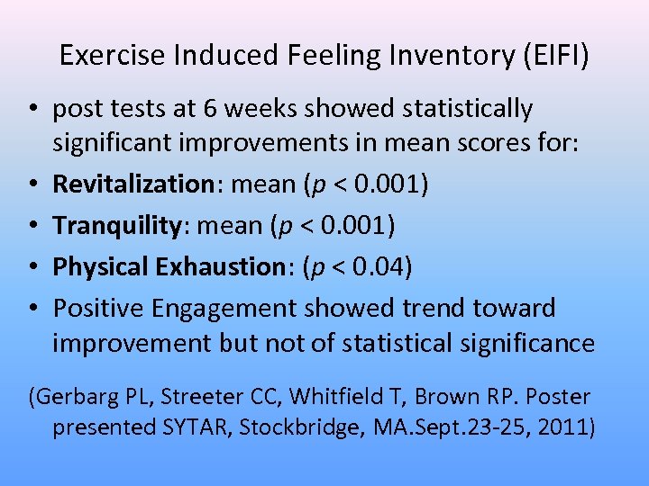 Exercise Induced Feeling Inventory (EIFI) • post tests at 6 weeks showed statistically significant improvements in mean scores for: • Revitalization: mean (p < 0. 001) • Tranquility: mean (p < 0. 001) • Physical Exhaustion: (p < 0. 04) • Positive Engagement showed trend toward improvement but not of statistical significance (Gerbarg PL, Streeter CC, Whitfield T, Brown RP. Poster presented SYTAR, Stockbridge, MA. Sept. 23 -25, 2011)