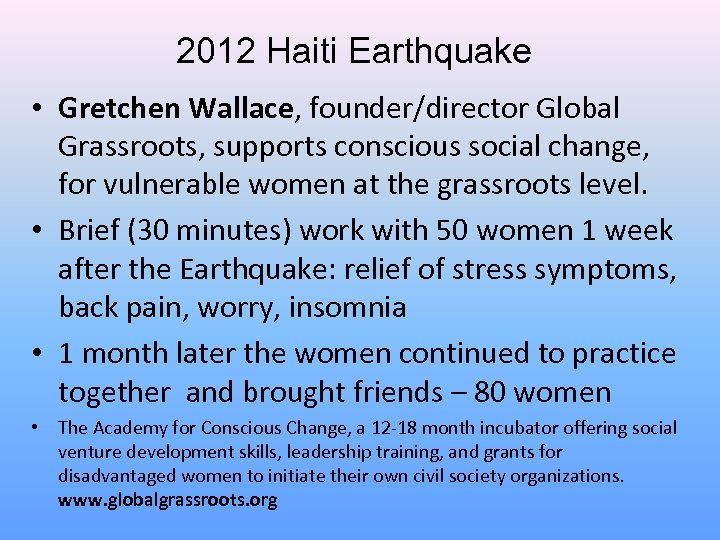 2012 Haiti Earthquake • Gretchen Wallace, founder/director Global Grassroots, supports conscious social change, for vulnerable women at the grassroots level. • Brief (30 minutes) work with 50 women 1 week after the Earthquake: relief of stress symptoms, back pain, worry, insomnia • 1 month later the women continued to practice together and brought friends – 80 women • The Academy for Conscious Change, a 12 -18 month incubator offering social venture development skills, leadership training, and grants for disadvantaged women to initiate their own civil society organizations. www. globalgrassroots. org