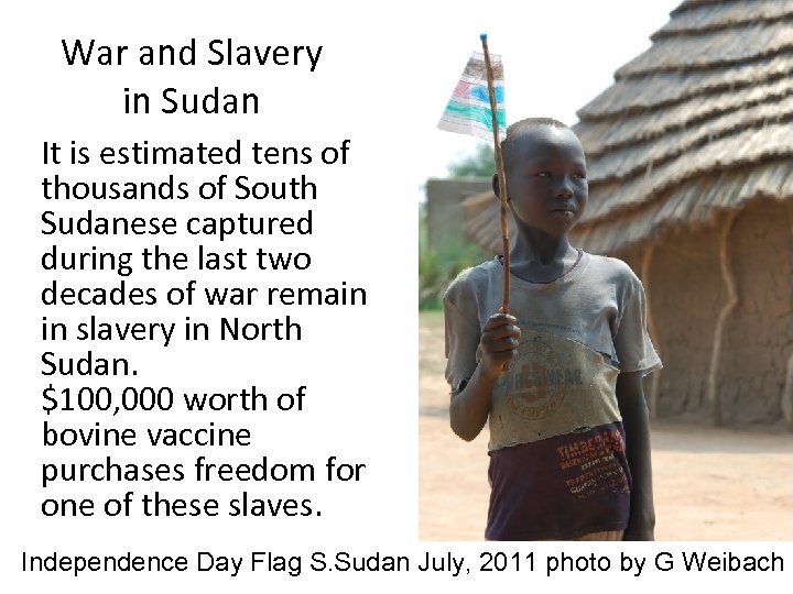 War and Slavery in Sudan It is estimated tens of thousands of South Sudanese captured during the last two decades of war remain in slavery in North Sudan. $100, 000 worth of bovine vaccine purchases freedom for one of these slaves. Independence Day Flag S. Sudan July, 2011 photo by G Weibach