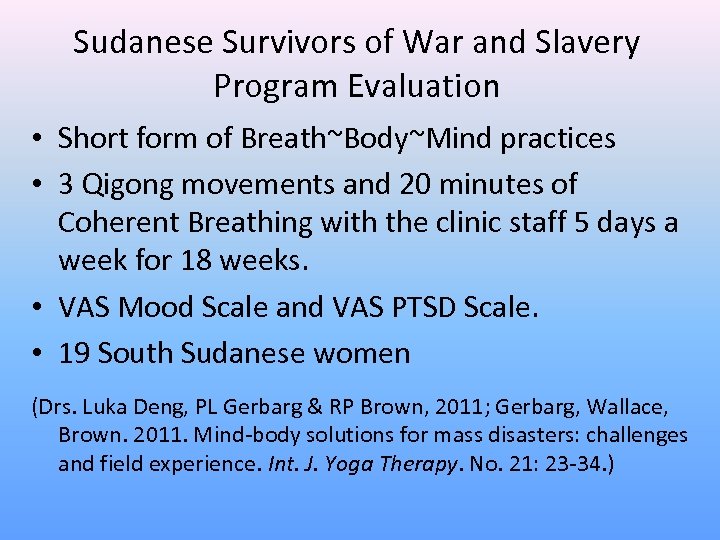 Sudanese Survivors of War and Slavery Program Evaluation • Short form of Breath~Body~Mind practices • 3 Qigong movements and 20 minutes of Coherent Breathing with the clinic staff 5 days a week for 18 weeks. • VAS Mood Scale and VAS PTSD Scale. • 19 South Sudanese women (Drs. Luka Deng, PL Gerbarg & RP Brown, 2011; Gerbarg, Wallace, Brown. 2011. Mind-body solutions for mass disasters: challenges and field experience. Int. J. Yoga Therapy. No. 21: 23 -34. )