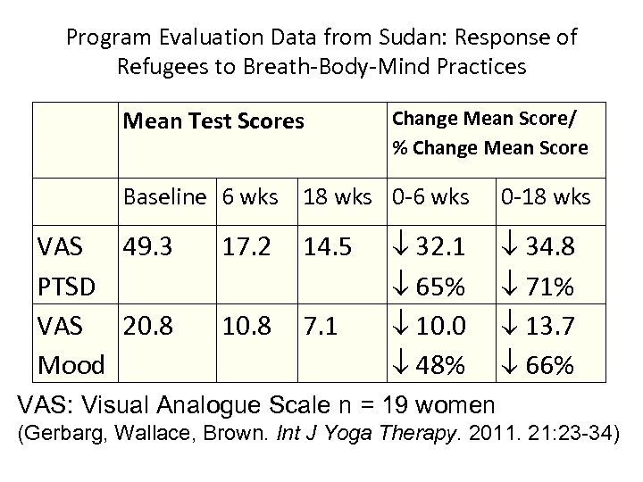 Program Evaluation Data from Sudan: Response of Refugees to Breath-Body-Mind Practices Mean Test Scores Change Mean Score/ % Change Mean Score Baseline 6 wks 18 wks 0 -6 wks VAS 49. 3 PTSD VAS 20. 8 Mood 17. 2 14. 5 10. 8 7. 1 0 -18 wks 32. 1 34. 8 65% 71% 10. 0 13. 7 48% 66% VAS: Visual Analogue Scale n = 19 women (Gerbarg, Wallace, Brown. Int J Yoga Therapy. 2011. 21: 23 -34)