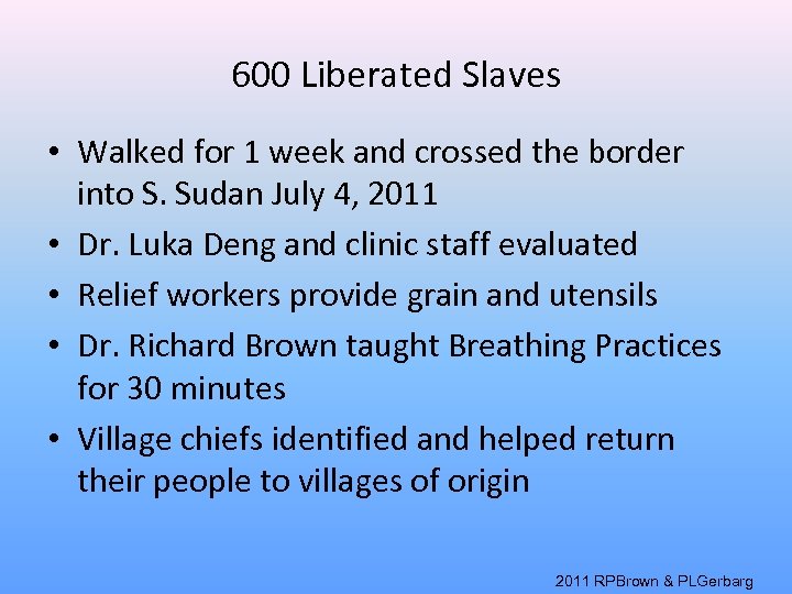 600 Liberated Slaves • Walked for 1 week and crossed the border into S. Sudan July 4, 2011 • Dr. Luka Deng and clinic staff evaluated • Relief workers provide grain and utensils • Dr. Richard Brown taught Breathing Practices for 30 minutes • Village chiefs identified and helped return their people to villages of origin 2011 RPBrown & PLGerbarg