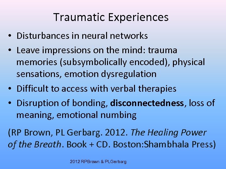 Traumatic Experiences • Disturbances in neural networks • Leave impressions on the mind: trauma memories (subsymbolically encoded), physical sensations, emotion dysregulation • Difficult to access with verbal therapies • Disruption of bonding, disconnectedness, loss of meaning, emotional numbing (RP Brown, PL Gerbarg. 2012. The Healing Power of the Breath. Book + CD. Boston: Shambhala Press) 2012 RPBrown & PLGerbarg