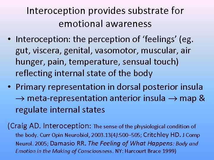 Interoception provides substrate for emotional awareness • Interoception: the perception of ‘feelings’ (eg. gut, viscera, genital, vasomotor, muscular, air hunger, pain, temperature, sensual touch) reflecting internal state of the body • Primary representation in dorsal posterior insula meta-representation anterior insula map & regulate internal states (Craig AD. Interoception: The sense of the physiological condition of the body. Curr Opin Neurobiol, 2003. 13(4): 500– 505; Critchley HD. J Comp Neurol. 2005; Damasio RR. The Feeling of What Happens: Body and Emotion in the Making of Consciousness. NY: Harcourt Brace 1999)