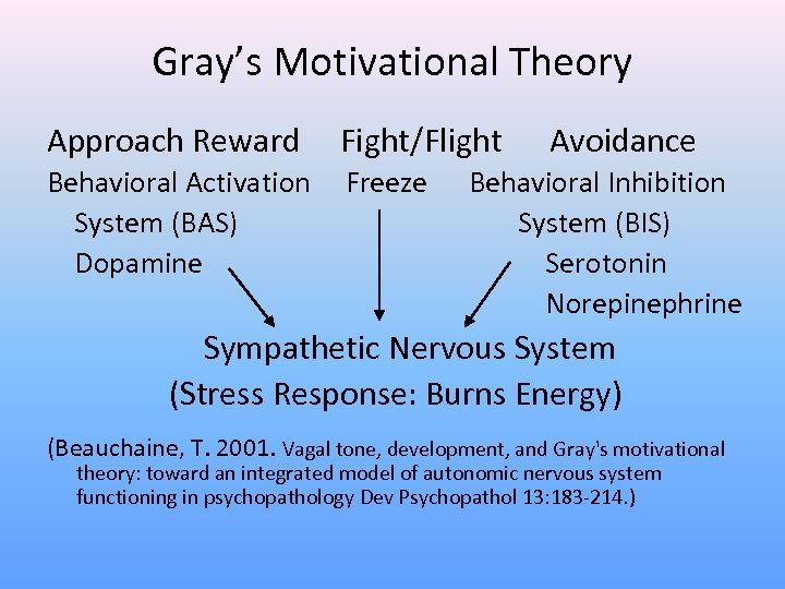 Gray’s Motivational Theory Approach Reward Fight/Flight Avoidance Behavioral Activation Freeze Behavioral Inhibition System (BAS) System (BIS) Dopamine Serotonin Norepinephrine Sympathetic Nervous System (Stress Response: Burns Energy) (Beauchaine, T. 2001. Vagal tone, development, and Gray's motivational theory: toward an integrated model of autonomic nervous system functioning in psychopathology Dev Psychopathol 13: 183 -214. )