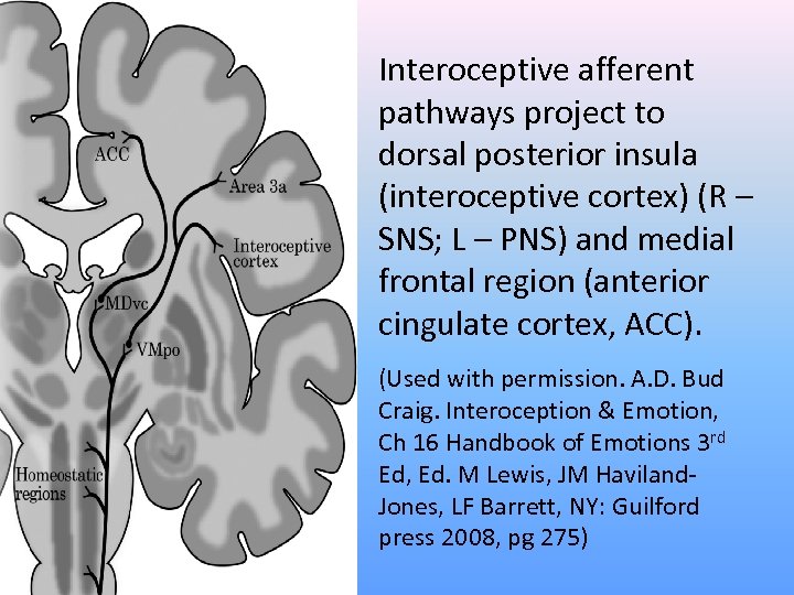 Anatomical Model The subjective awareness of feelings from the body is generated directly from cortical rerepresentations of the interoceptive image of the body’s homeostatic condition. (AD (BUD) CRAIG Interoception and Emotion: A Neuroanatomical Perspective. Handbook of Emotions, 3 rd Edition, ed. M Lewis, J Haviland-Jones, LF Barrett. NY: Guilford Press. 2008) 2012 RPBrown & PLGerbarg