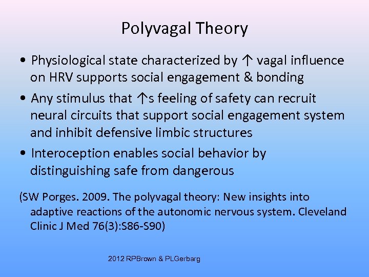 Polyvagal Theory • Physiological state characterized by ↑ vagal influence on HRV supports social engagement & bonding • Any stimulus that ↑s feeling of safety can recruit neural circuits that support social engagement system and inhibit defensive limbic structures • Interoception enables social behavior by distinguishing safe from dangerous (SW Porges. 2009. The polyvagal theory: New insights into adaptive reactions of the autonomic nervous system. Cleveland Clinic J Med 76(3): S 86 -S 90) 2012 RPBrown & PLGerbarg