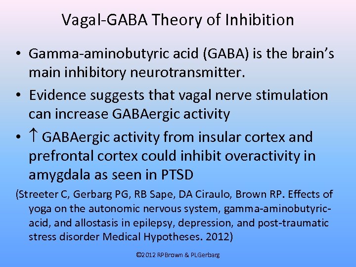 Vagal-GABA Theory of Inhibition • Gamma-aminobutyric acid (GABA) is the brain’s main inhibitory neurotransmitter. • Evidence suggests that vagal nerve stimulation can increase GABAergic activity • GABAergic activity from insular cortex and prefrontal cortex could inhibit overactivity in amygdala as seen in PTSD (Streeter C, Gerbarg PG, RB Sape, DA Ciraulo, Brown RP. Effects of yoga on the autonomic nervous system, gamma-aminobutyricacid, and allostasis in epilepsy, depression, and post-traumatic stress disorder Medical Hypotheses. 2012) © 2012 RPBrown & PLGerbarg