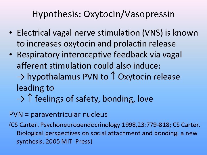 Hypothesis: Oxytocin/Vasopressin • Electrical vagal nerve stimulation (VNS) is known to increases oxytocin and prolactin release • Respiratory interoceptive feedback via vagal afferent stimulation could also induce: → hypothalamus PVN to Oxytocin release leading to → feelings of safety, bonding, love PVN = paraventricular nucleus (CS Carter. Psychoneurooendocrinology 1998, 23: 779 -818; CS Carter. Biological perspectives on social attachment and bonding: a new synthesis. 2005 MIT Press)