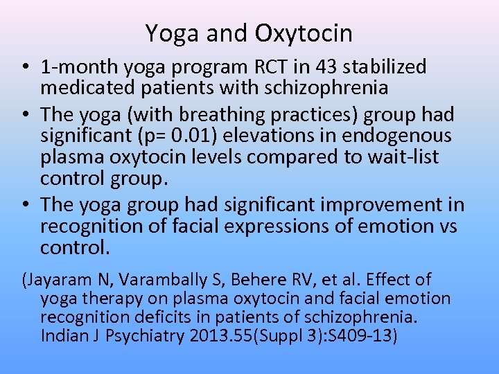 Yoga and Oxytocin • 1 -month yoga program RCT in 43 stabilized medicated patients with schizophrenia • The yoga (with breathing practices) group had significant (p= 0. 01) elevations in endogenous plasma oxytocin levels compared to wait-list control group. • The yoga group had significant improvement in recognition of facial expressions of emotion vs control. (Jayaram N, Varambally S, Behere RV, et al. Effect of yoga therapy on plasma oxytocin and facial emotion recognition deficits in patients of schizophrenia. Indian J Psychiatry 2013. 55(Suppl 3): S 409 -13)