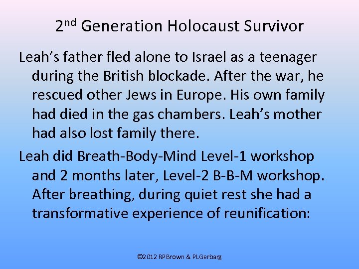 2 nd Generation Holocaust Survivor Leah’s father fled alone to Israel as a teenager during the British blockade. After the war, he rescued other Jews in Europe. His own family had died in the gas chambers. Leah’s mother had also lost family there. Leah did Breath-Body-Mind Level-1 workshop and 2 months later, Level-2 B-B-M workshop. After breathing, during quiet rest she had a transformative experience of reunification: © 2012 RPBrown & PLGerbarg