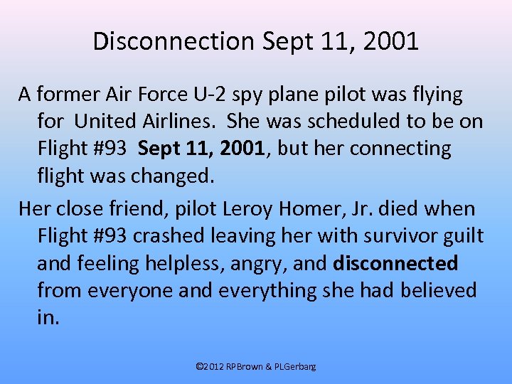 Disconnection Sept 11, 2001 A former Air Force U-2 spy plane pilot was flying for United Airlines. She was scheduled to be on Flight #93 Sept 11, 2001, but her connecting flight was changed. Her close friend, pilot Leroy Homer, Jr. died when Flight #93 crashed leaving her with survivor guilt and feeling helpless, angry, and disconnected from everyone and everything she had believed in. © 2012 RPBrown & PLGerbarg