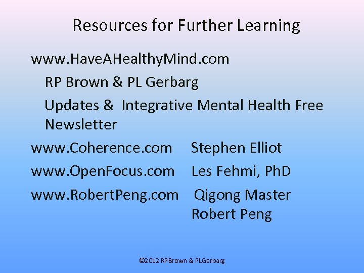 Resources for Further Learning www. Have. AHealthy. Mind. com RP Brown & PL Gerbarg Updates & Integrative Mental Health Free Newsletter www. Coherence. com Stephen Elliot www. Open. Focus. com Les Fehmi, Ph. D www. Robert. Peng. com Qigong Master Robert Peng © 2012 RPBrown & PLGerbarg