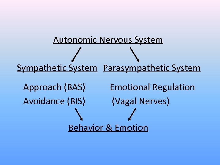 Autonomic Nervous System Sympathetic System Parasympathetic System Approach (BAS) Avoidance (BIS) Emotional Regulation (Vagal Nerves) Behavior & Emotion
