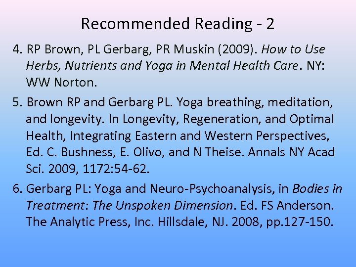 Recommended Reading - 2 4. RP Brown, PL Gerbarg, PR Muskin (2009). How to Use Herbs, Nutrients and Yoga in Mental Health Care. NY: WW Norton. 5. Brown RP and Gerbarg PL. Yoga breathing, meditation, and longevity. In Longevity, Regeneration, and Optimal Health, Integrating Eastern and Western Perspectives, Ed. C. Bushness, E. Olivo, and N Theise. Annals NY Acad Sci. 2009, 1172: 54 -62. 6. Gerbarg PL: Yoga and Neuro-Psychoanalysis, in Bodies in Treatment: The Unspoken Dimension. Ed. FS Anderson. The Analytic Press, Inc. Hillsdale, NJ. 2008, pp. 127 -150.