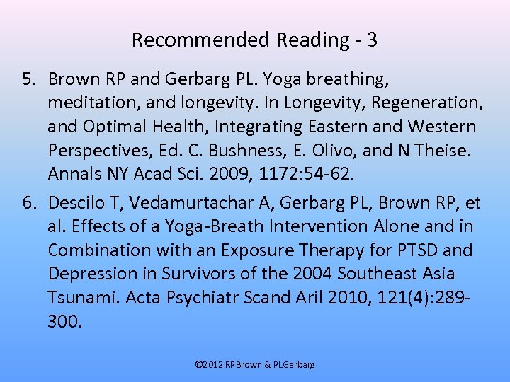 Recommended Reading - 3 5. Brown RP and Gerbarg PL. Yoga breathing, meditation, and longevity. In Longevity, Regeneration, and Optimal Health, Integrating Eastern and Western Perspectives, Ed. C. Bushness, E. Olivo, and N Theise. Annals NY Acad Sci. 2009, 1172: 54 -62. 6. Descilo T, Vedamurtachar A, Gerbarg PL, Brown RP, et al. Effects of a Yoga-Breath Intervention Alone and in Combination with an Exposure Therapy for PTSD and Depression in Survivors of the 2004 Southeast Asia Tsunami. Acta Psychiatr Scand Aril 2010, 121(4): 289300. © 2012 RPBrown & PLGerbarg