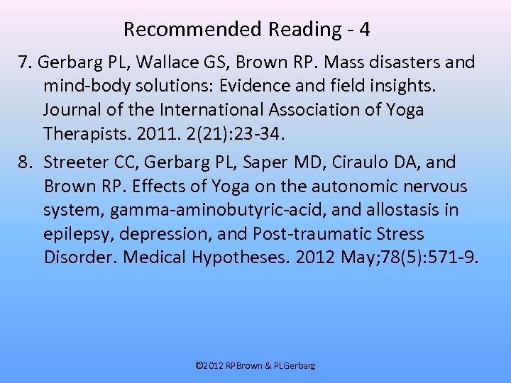 Recommended Reading - 4 7. Gerbarg PL, Wallace GS, Brown RP. Mass disasters and mind-body solutions: Evidence and field insights. Journal of the International Association of Yoga Therapists. 2011. 2(21): 23 -34. 8. Streeter CC, Gerbarg PL, Saper MD, Ciraulo DA, and Brown RP. Effects of Yoga on the autonomic nervous system, gamma-aminobutyric-acid, and allostasis in epilepsy, depression, and Post-traumatic Stress Disorder. Medical Hypotheses. 2012 May; 78(5): 571 -9. © 2012 RPBrown & PLGerbarg