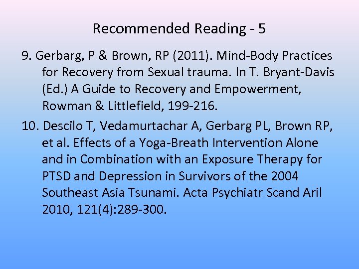 Recommended Reading - 5 9. Gerbarg, P & Brown, RP (2011). Mind-Body Practices for Recovery from Sexual trauma. In T. Bryant-Davis (Ed. ) A Guide to Recovery and Empowerment, Rowman & Littlefield, 199 -216. 10. Descilo T, Vedamurtachar A, Gerbarg PL, Brown RP, et al. Effects of a Yoga-Breath Intervention Alone and in Combination with an Exposure Therapy for PTSD and Depression in Survivors of the 2004 Southeast Asia Tsunami. Acta Psychiatr Scand Aril 2010, 121(4): 289 -300.