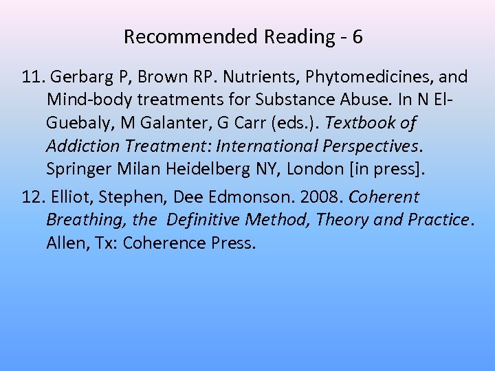 Recommended Reading - 6 11. Gerbarg P, Brown RP. Nutrients, Phytomedicines, and Mind-body treatments for Substance Abuse. In N El. Guebaly, M Galanter, G Carr (eds. ). Textbook of Addiction Treatment: International Perspectives. Springer Milan Heidelberg NY, London [in press]. 12. Elliot, Stephen, Dee Edmonson. 2008. Coherent Breathing, the Definitive Method, Theory and Practice. Allen, Tx: Coherence Press.
