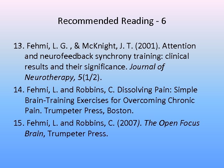 Recommended Reading - 6 13. Fehmi, L. G. , & Mc. Knight, J. T. (2001). Attention and neurofeedback synchrony training: clinical results and their significance. Journal of Neurotherapy, 5(1/2). 14. Fehmi, L. and Robbins, C. Dissolving Pain: Simple Brain-Training Exercises for Overcoming Chronic Pain. Trumpeter Press, Boston. 15. Fehmi, L. and Robbins, C. (2007). The Open Focus Brain, Trumpeter Press.