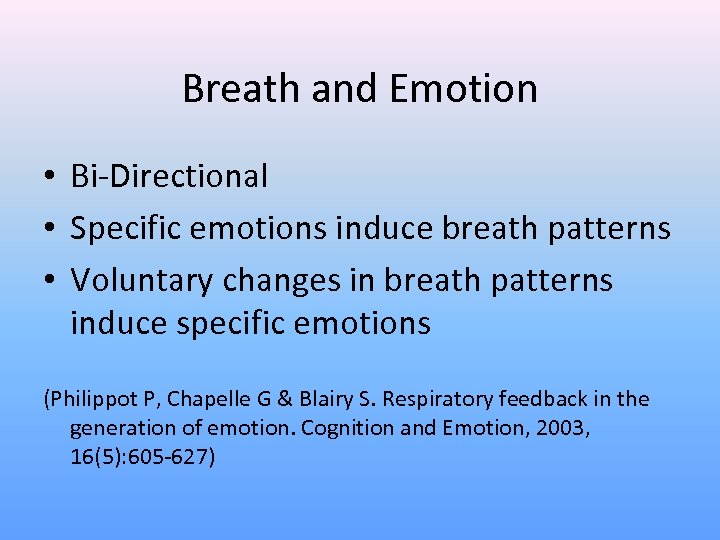 Breath and Emotion • Bi-Directional • Specific emotions induce breath patterns • Voluntary changes in breath patterns induce specific emotions (Philippot P, Chapelle G & Blairy S. Respiratory feedback in the generation of emotion. Cognition and Emotion, 2003, 16(5): 605 -627)