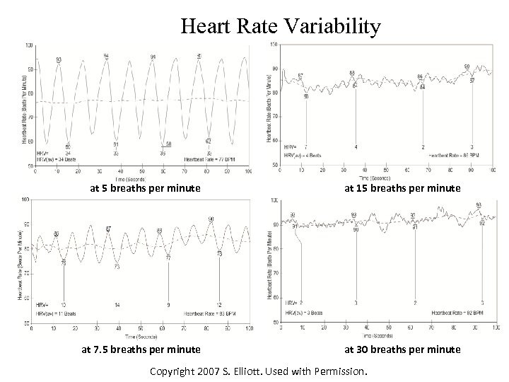 Heart Rate Variability at 5 breaths per minute at 15 breaths per minute at 7. 5 breaths per minute at 30 breaths per minute Copyright 2007 S. Elliott. Used with Permission.