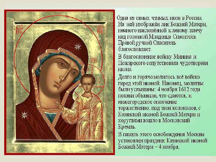 Вопрос 6: Икона Божией Матери, в день празднования которой 4 ноября отмечается и государственный праздник – День народного единства. Расскажите историческую ситуацию того времени А. Владимирская Б. Державная В. Казанская Г. Иверская