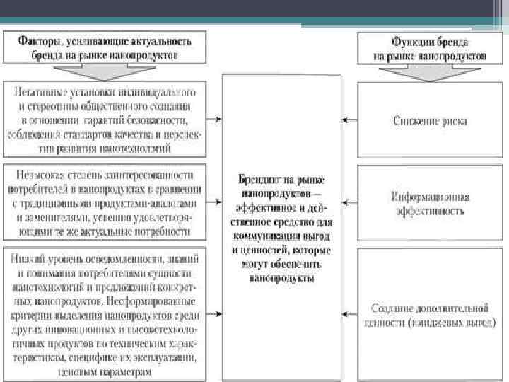 • Брендинг на рынке нанотехнологий представляет собой эффективное и действенное средство для коммуникации тех выгод и ценностей, которые может обеспечить нанопродукт. Бренды на рынке нанопродуктов, пользующиеся доверием, выступают в качестве критериев, помогающих покупателям ориентироваться в потоке информации о высокотехнологичной продукции и обеспечивающих им выгоды и преимущества от использования нанопродуктов и нанотехнологий.
