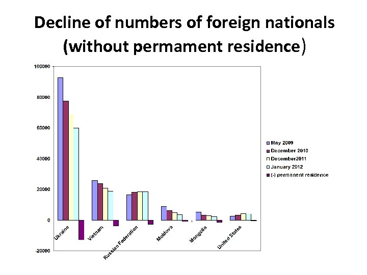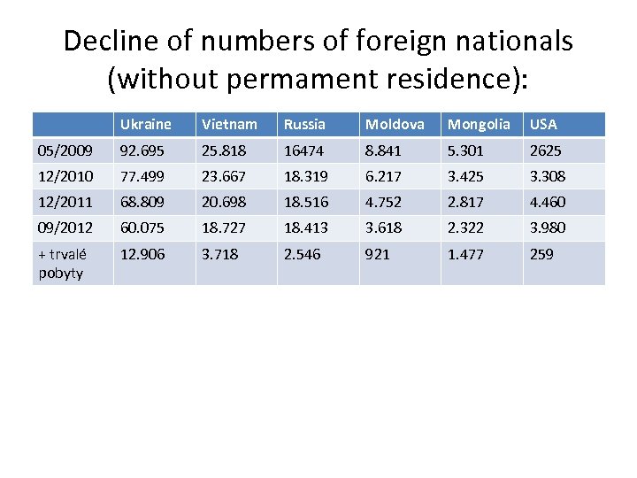 Decline of numbers of foreign nationals (without permament residence): Ukraine Vietnam Russia Moldova Mongolia USA 05/2009 92. 695 25. 818 16474 8. 841 5. 301 2625 12/2010 77. 499 23. 667 18. 319 6. 217 3. 425 3. 308 12/2011 68. 809 20. 698 18. 516 4. 752 2. 817 4. 460 09/2012 60. 075 18. 727 18. 413 3. 618 2. 322 3. 980 + trvalé pobyty 12. 906 3. 718 2. 546 921 1. 477 259