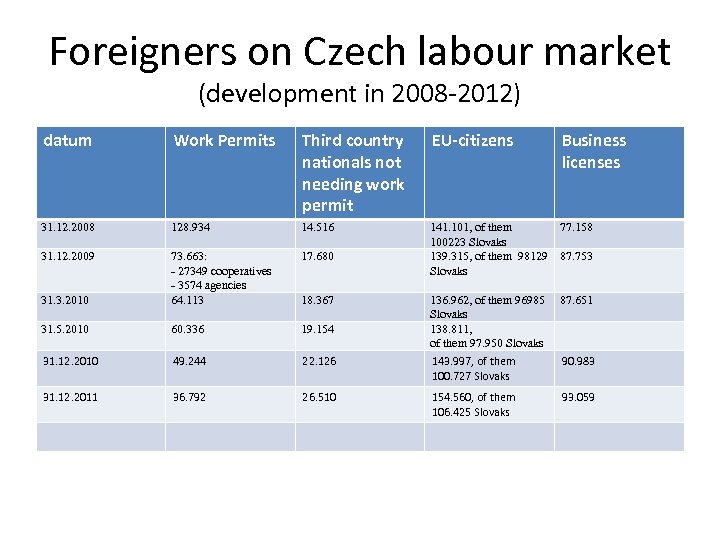 Foreigners on Czech labour market (development in 2008 -2012) datum Work Permits Third country nationals not needing work permit EU-citizens 31. 12. 2008 128. 934 14. 516 31. 12. 2009 17. 680 31. 3. 2010 73. 663: - 27349 cooperatives - 3574 agencies 64. 113 141. 101, of them 77. 158 100223 Slovaks 139. 315, of them 98129 87. 753 Slovaks 31. 5. 2010 60. 336 19. 154 31. 12. 2010 49. 244 22. 126 143. 997, of them 100. 727 Slovaks 90. 983 31. 12. 2011 36. 792 26. 510 154. 560, of them 106. 425 Slovaks 93. 059 18. 367 Business licenses 136. 962, of them 96985 87. 651 Slovaks 138. 811, of them 97. 950 Slovaks