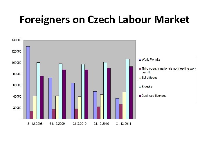 Foreigners on Czech Labour Market datum Počet pracovních povolení Cizinci – zaměstnanci nepotřebující pracovní povolení Cizinci z EU Živnosti 31. 12. 2008 128. 934 14. 516 77. 158 31. 12. 2009 17. 680 31. 3. 2010 73. 663: - 27349 družstva - 3574 agentury 64. 113 141. 101, z toho 100223 Slováků 139. 315, z toho 98129 Slováků 87. 651 31. 5. 2010 60. 336 19. 154 136. 962, z toho 96985 Slováků 138. 811 z toho 97. 950 Slováků 31. 12. 2010 49. 244 22. 126 143. 997 SLOVAKU 100. 727 90. 983 31. 12. 2011 36. 792 26. 510 154. 560, Slováků 106. 425 93. 059 18. 367 87. 753
