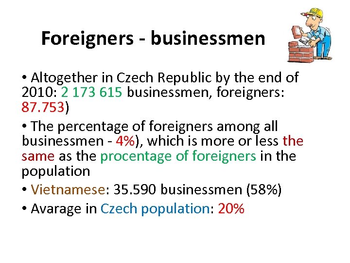 Foreigners - businessmen • Altogether in Czech Republic by the end of 2010: 2 173 615 businessmen, foreigners: 87. 753) • The percentage of foreigners among all businessmen - 4%), which is more or less the same as the procentage of foreigners in the population • Vietnamese: 35. 590 businessmen (58%) • Avarage in Czech population: 20%