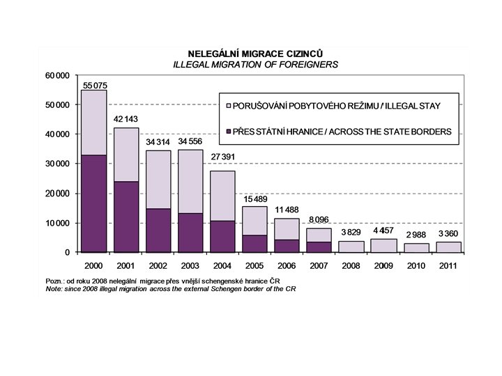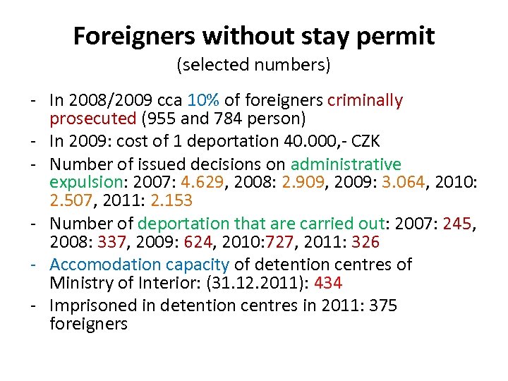 Foreigners without stay permit (selected numbers) - In 2008/2009 cca 10% of foreigners criminally prosecuted (955 and 784 person) - In 2009: cost of 1 deportation 40. 000, - CZK - Number of issued decisions on administrative expulsion: 2007: 4. 629, 2008: 2. 909, 2009: 3. 064, 2010: 2. 507, 2011: 2. 153 - Number of deportation that are carried out: 2007: 245, 2008: 337, 2009: 624, 2010: 727, 2011: 326 - Accomodation capacity of detention centres of Ministry of Interior: (31. 12. 2011): 434 - Imprisoned in detention centres in 2011: 375 foreigners
