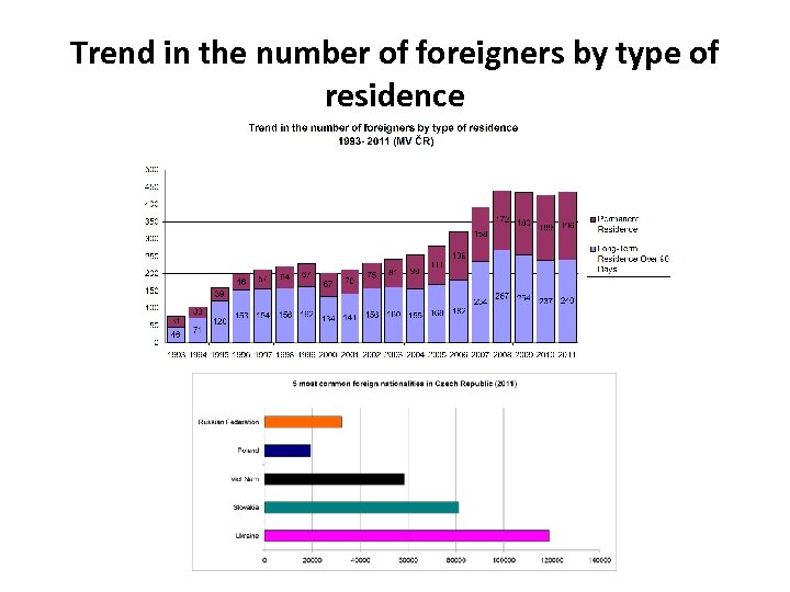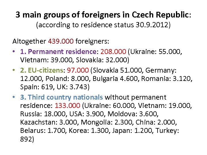 3 main groups of foreigners in Czech Republic: (according to residence status 30. 9. 2012) Altogether 439. 000 foreigners: • 1. Permanent residence: 208. 000 (Ukraine: 55. 000, Vietnam: 39. 000, Slovakia: 32. 000) • 2. EU-citizens: 97. 000 (Slovakia 51. 000, Germany: 12. 000, Poland: 8. 000, Bulgaria 4. 600, Romania: 3. 120, Spain: 619, UK: 3. 743) • 3. Third country nationals without permanent residence: 133. 000 (Ukraine: 60. 000, Vietnam: 19. 000, Russia: 18. 000, USA: 3. 900, Moldova: 3. 600, Kazachstan: 3. 000, Mongolia: 2. 300, China: 2. 000, Belarus: 1. 700, Korea: 1. 300, Japan: 1. 200, Turkey: 892)