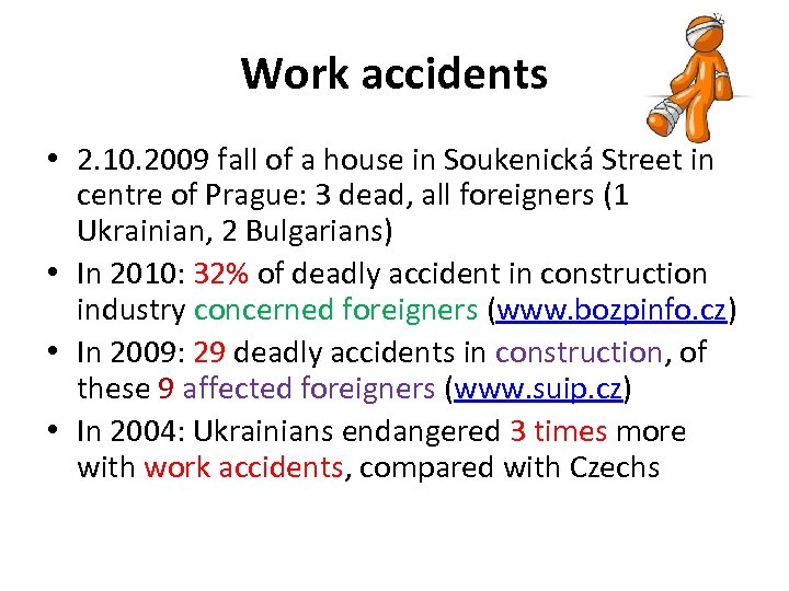 Work accidents • 2. 10. 2009 fall of a house in Soukenická Street in centre of Prague: 3 dead, all foreigners (1 Ukrainian, 2 Bulgarians) • In 2010: 32% of deadly accident in construction industry concerned foreigners (www. bozpinfo. cz) • In 2009: 29 deadly accidents in construction, of these 9 affected foreigners (www. suip. cz) • In 2004: Ukrainians endangered 3 times more with work accidents, compared with Czechs