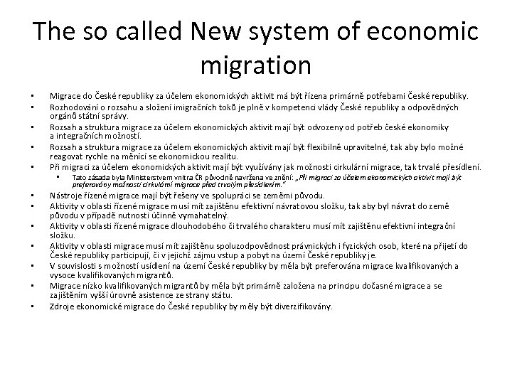 The so called New system of economic migration • • • Migrace do České republiky za účelem ekonomických aktivit má být řízena primárně potřebami České republiky. Rozhodování o rozsahu a složení imigračních toků je plně v kompetenci vlády České republiky a odpovědných orgánů státní správy. Rozsah a struktura migrace za účelem ekonomických aktivit mají být odvozeny od potřeb české ekonomiky a integračních možností. Rozsah a struktura migrace za účelem ekonomických aktivit mají být flexibilně upravitelné, tak aby bylo možné reagovat rychle na měnící se ekonomickou realitu. Při migraci za účelem ekonomických aktivit mají být využívány jak možnosti cirkulární migrace, tak trvalé přesídlení. • • Tato zásada byla Ministerstvem vnitra ČR původně navržena ve znění: „Při migraci za účelem ekonomických aktivit mají být preferovány možnosti cirkulární migrace před trvalým přesídlením. “ Nástroje řízené migrace mají být řešeny ve spolupráci se zeměmi původu. Aktivity v oblasti řízené migrace musí mít zajištěnu efektivní návratovou složku, tak aby byl návrat do země původu v případě nutnosti účinně vymahatelný. Aktivity v oblasti řízené migrace dlouhodobého či trvalého charakteru musí mít zajištěnu efektivní integrační složku. Aktivity v oblasti migrace musí mít zajištěnu spoluzodpovědnost právnických i fyzických osob, které na přijetí do České republiky participují, či v jejichž zájmu vstup a pobyt na území České republiky je. V souvislosti s možností usídlení na území České republiky by měla být preferována migrace kvalifikovaných a vysoce kvalifikovaných migrantů. Migrace nízko kvalifikovaných migrantů by měla být primárně založena na principu dočasné migrace a se zajištěním vyšší úrovně asistence ze strany státu. Zdroje ekonomické migrace do České republiky by měly být diverzifikovány.
