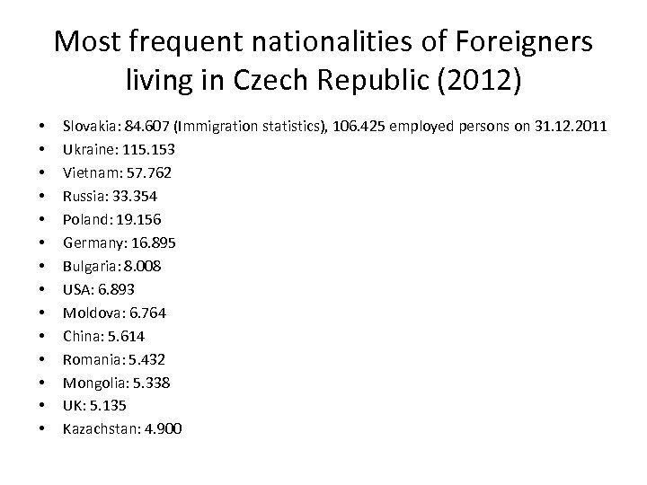 Most frequent nationalities of Foreigners living in Czech Republic (2012) • • • • Slovakia: 84. 607 (Immigration statistics), 106. 425 employed persons on 31. 12. 2011 Ukraine: 115. 153 Vietnam: 57. 762 Russia: 33. 354 Poland: 19. 156 Germany: 16. 895 Bulgaria: 8. 008 USA: 6. 893 Moldova: 6. 764 China: 5. 614 Romania: 5. 432 Mongolia: 5. 338 UK: 5. 135 Kazachstan: 4. 900