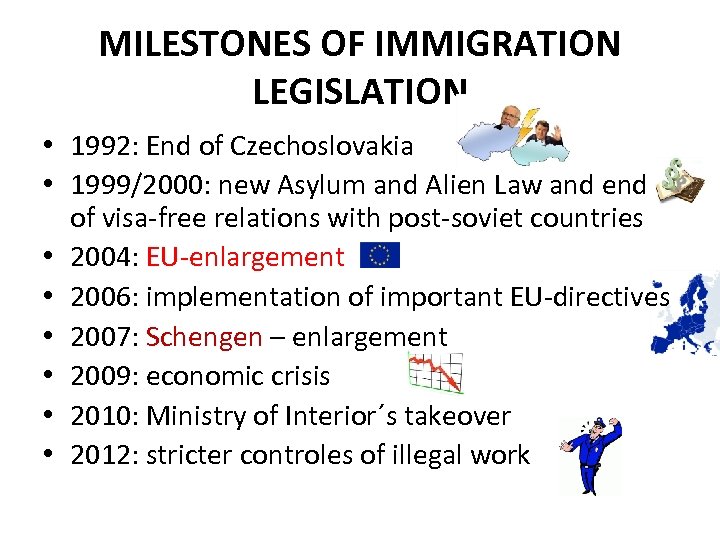 MILESTONES OF IMMIGRATION LEGISLATION • 1992: End of Czechoslovakia • 1999/2000: new Asylum and Alien Law and end of visa-free relations with post-soviet countries • 2004: EU-enlargement • 2006: implementation of important EU-directives • 2007: Schengen – enlargement • 2009: economic crisis • 2010: Ministry of Interior´s takeover • 2012: stricter controles of illegal work