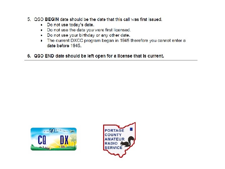 LOTW Tips • Your mailing address registered with the FCC must be accurate! • Getting your certificate and starting will seem tedious • An internet connection will be necessary • Manual entry of log data to LOTW is possible but impractical; you should be using a logging program that exports log records in ADIF or Cabrillo format.
