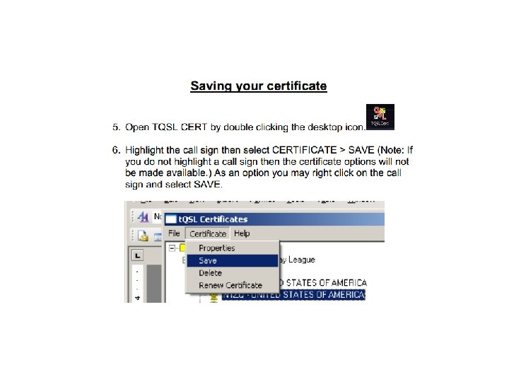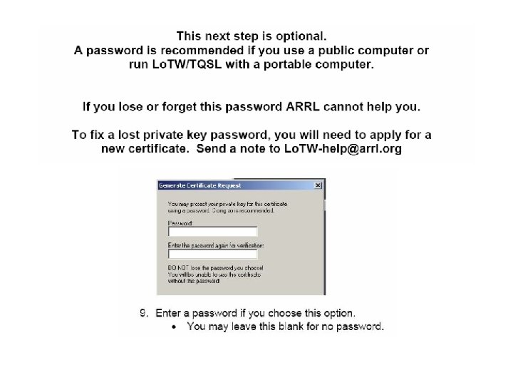 Setting up a new LOTW account Set up a new folder on your hard drive for LOTW The basic steps to creating a LOTW account: 1. Download the TQSL software from the ARRL • Software is Operating System Specific (windows, MAC, Linux) 2. Create a certificate request for your call sign 3. Upload the request (then wait for postcard) 4. Authenticate your request (With 8 digit code on postcard) 5. Load the certificate (emailed to you by ARRL) 6. Create station location(s) 7. Back up the certificate Detailed step by step instructions at: http: //www. arrl. org/instructions