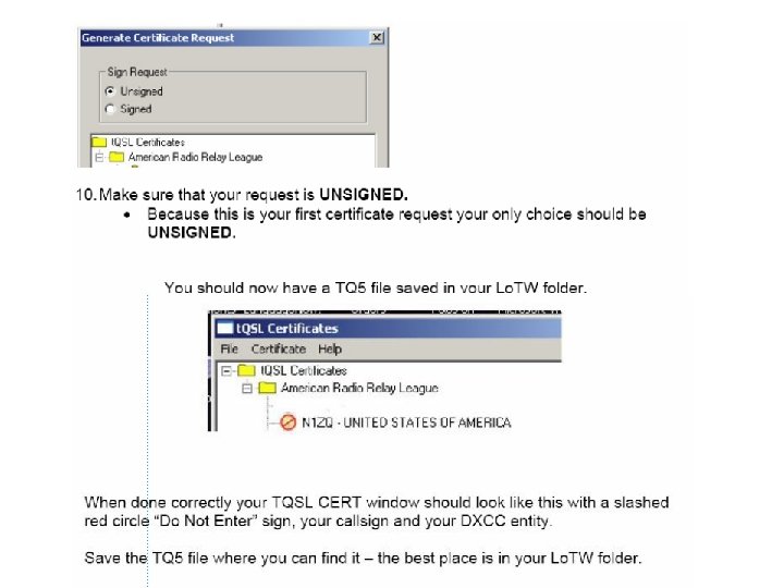 At this point you have created your initial LOTW Certificate REQUEST As indicated by the slash, this certificate must be authenticated before it can be used to sign QSO files. Remember where you stored this request (. TQ 5) file This is what my t. QSL certificate list looks like: