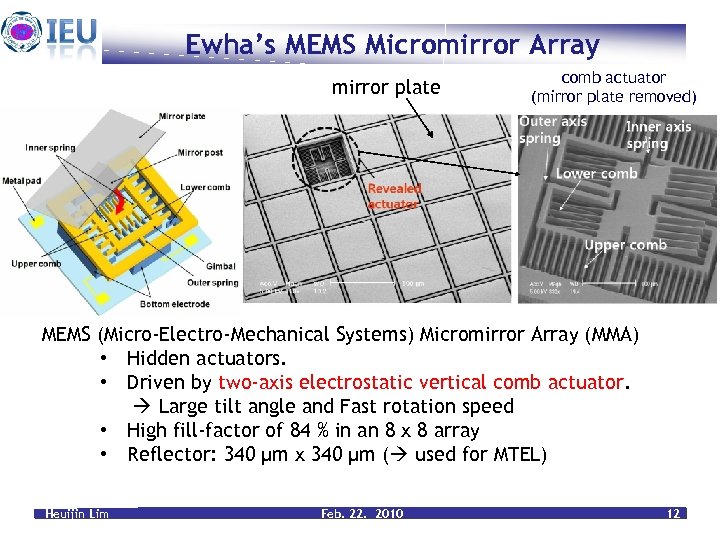Ewha’s MEMS Micromirror Array mirror plate comb actuator (mirror plate removed) MEMS (Micro-Electro-Mechanical Systems) Micromirror Array (MMA) • Hidden actuators. • Driven by two-axis electrostatic vertical comb actuator. Large tilt angle and Fast rotation speed • High fill-factor of 84 % in an 8 x 8 array • Reflector: 340 µm x 340 µm ( used for MTEL) Heuijin Lim Feb. 22. 2010 12