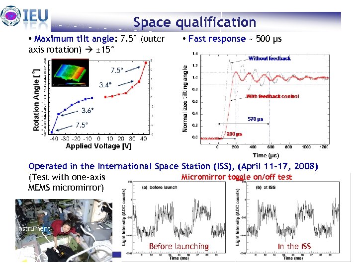 Space qualification • Maximum tilt angle: 7. 5° (outer axis rotation) ± 15° • Fast response ~ 500 μs Operated in the International Space Station (ISS), (April 11 -17, 2008) Micromirror toggle on/off test (Test with one-axis MEMS micromirror) Instrument Before launching Heuijin Lim Feb. 22. 2010 In the ISS 13