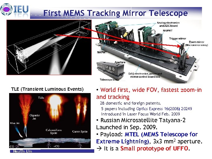 First MEMS Tracking Mirror Telescope TLE (Transient Luminous Events) • World first, wide FOV, fastest zoom-in and tracking 28 domestic and foreign patents. 5 papers including Optics Express 16(2008) 20249 Introduced in Laser Focus World Feb. 2009 Heuijin Lim • Russian Microsatellite Tatyana-2 Launched in Sep. 2009. • Payload: MTEL (MEMS Telescope for Extreme Lightning), 3 x 3 mm 2 aperture. It is a Small prototype of UFFO. 14 Feb. 22. 2010