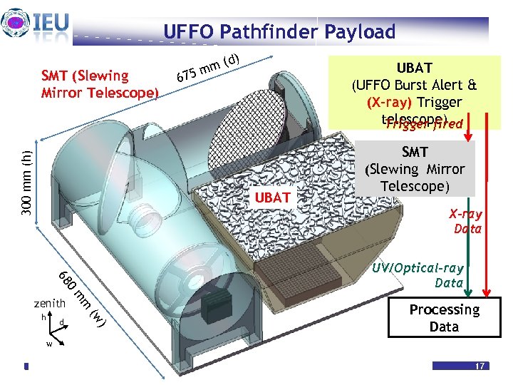 UFFO Pathfinder Payload 300 mm (h) SMT (Slewing Mirror Telescope) (d) m 75 m UBAT (UFFO Burst Alert & (X-ray) Trigger telescope) Trigger fired 6 UBAT SMT (Slewing Mirror Telescope) X-ray Data 68 UV/Optical-ray Data 0 Processing Data m d ) (w h m zenith w Heuijin Lim Feb. 22. 2010 17