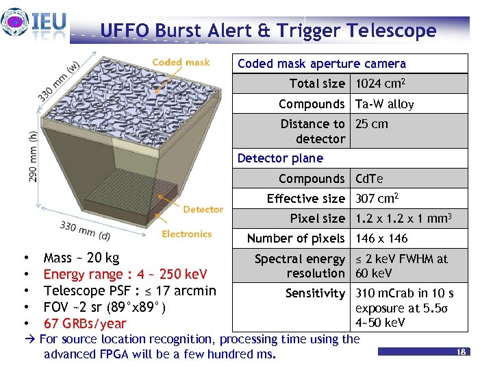 UFFO Burst Alert & Trigger Telescope Coded mask aperture camera Total size 1024 cm 2 Compounds Ta-W alloy Distance to 25 cm detector Detector plane Compounds Cd. Te Effective size 307 cm 2 Pixel size 1. 2 x 1 mm 3 Number of pixels 146 x 146 • • • Mass ~ 20 kg Energy range : 4 ~ 250 ke. V Telescope PSF : ≤ 17 arcmin FOV ~2 sr (89°x 89°) 67 GRBs/year Spectral energy ≤ 2 ke. V FWHM at resolution 60 ke. V Sensitivity 310 m. Crab in 10 s exposure at 5. 5σ 4~50 ke. V For source location recognition, processing time using the Heuijin Lim Feb. 22. ms. 18 advanced FPGA will be a few hundred 2010