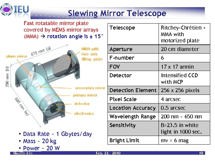 Slewing Mirror Telescope Fast rotatable mirror plate covered by MEMS mirror arrays (MMA) rotation angle is ± 15° Telescope Ritchey-Chrétien + MMA with motorized plate Aperture 20 cm diameter F-number 6 FOV 17 x 17 armin Detector Intensified CCD with MCP Detection Element 256 x 256 pixels Pixel Scale 4 arcsec Location Accuracy 0. 5 arcsec Wavelength Range 200 nm ~ 650 nm Sensitivity • Data Rate ~ 1 Gbytes/day • Mass ~ 20 kg • Power ~ 20 W Heuijin Lim B=23. 5 in white light in 1000 sec. Bright Limit mv = 6 mag Feb. 22. 2010 19