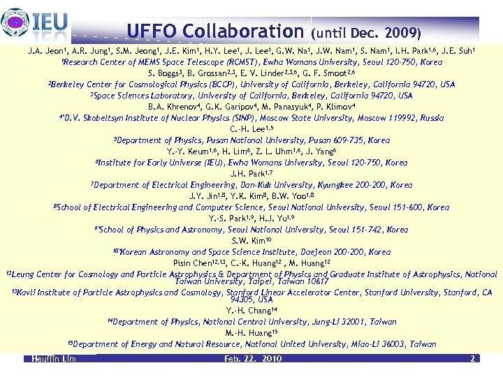 UFFO Collaboration (until Dec. 2009) J. A. Jeon 1, A. R. Jung 1, S. M. Jeong 1, J. E. Kim 1, H. Y. Lee 1, J. Lee 1, G. W. Na 1, J. W. Nam 1, S. Nam 1, I. H. Park 1, 6, J. E. Suh 1 1 Research Center of MEMS Space Telescope (RCMST), Ewha Womans University, Seoul 120 -750, Korea S. Boggs 3, B. Grossan 2, 3, E. V. Linder 2, 3, 6, G. F. Smoot 2, 6 2 Berkeley Center for Cosmological Physics (BCCP), University of California, Berkeley, California 94720, USA 3 Space Sciences Laboratory, University of California, Berkeley, California 94720, USA B. A. Khrenov 4, G. K. Garipov 4, M. Panasyuk 4, P. Klimov 4 4*D. V. Skobeltsyn Institute of Nuclear Physics (SINP), Moscow State University, Moscow 119992, Russia C. -H. Lee 1, 5 5 Department of Physics, Pusan National University, Pusan 609 -735, Korea Y. -Y. Keum 1, 6, H. Lim 6, Z. L. Uhm 1, 6, J. Yang 6 6 Institute for Early Universe (IEU), Ewha Womans University, Seoul 120 -750, Korea J. H. Park 1, 7 7 Department of Electrical Engineering, Dan-Kuk University, Kyungkee 200 -200, Korea J. Y. Jin 1, 8, Y. K. Kim 8, B. W. Yoo 1, 8 8 School of Electrical Engineering and Computer Science, Seoul National University, Seoul 151 -600, Korea Y. -S. Park 1, 9, H. J. Yu 1, 9 9*School of Physics and Astronomy, Seoul National University, Seoul 151 -742, Korea S. W. Kim 10 10*Korean Astronomy and Space Science Institute, Daejeon 200 -200, Korea Pisin Chen 12, 13, C. -K. Huang 12 , M. Huang 12 12 Leung Center for Cosmology and Particle Astrophysics & Department of Physics and Graduate Institute of Astrophysics, National Taiwan University, Taipei, Taiwan 10617 13 Kavli Institute of Particle Astrophysics and Cosmology, Stanford Linear Accelerator Center, Stanford University, Stanford, CA 94305, USA Y. -H. Chang 14 14 Department of Physics, National Central University, Jung-Li 32001, Taiwan M. -H. Huang 15 15 Department of Energy and Natural Resource, National United University, Miao-Li 36003, Taiwan Heuijin Lim Feb. 22. 2010 2
